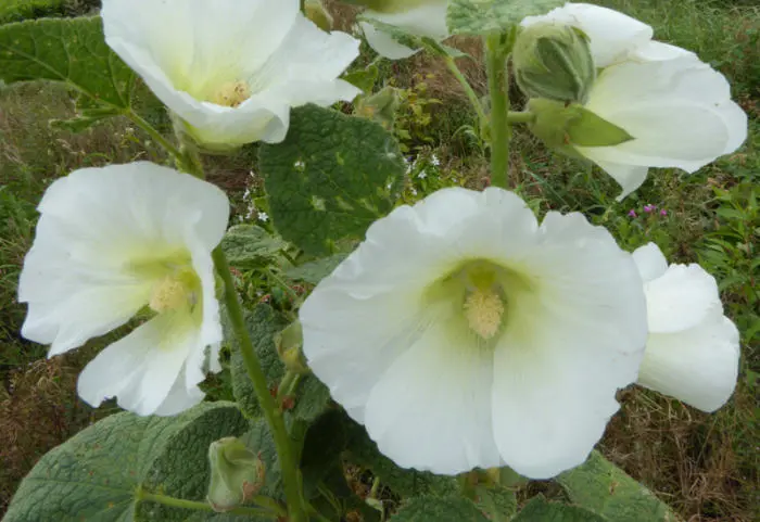 Alcea rosea Spotlight 'Polarstar' bloeit met enkelvoudige witte bloemen met een gelig hart.