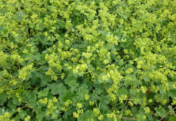 Bloeit met tuilen van kleine groengele bloempjes.