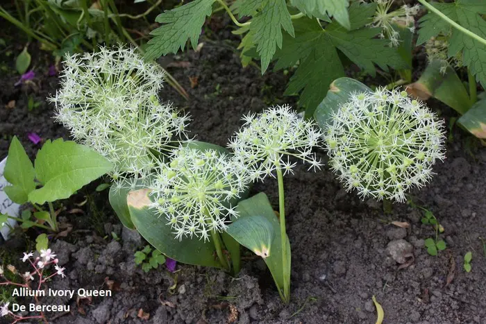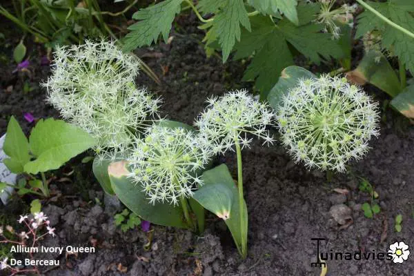 Allium karataviense 'Ivory Queen' is een laagblijvende bolgewas met brede, gewelfde, zilvergroene bladeren.
