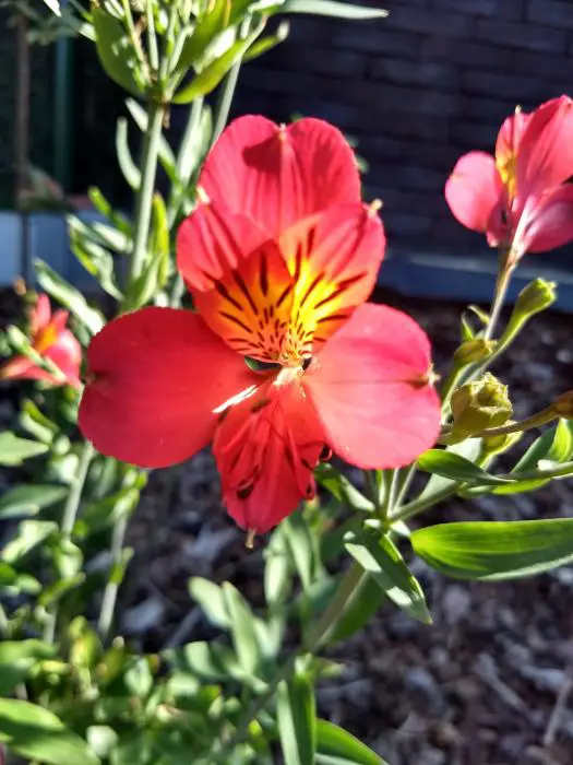 Alstroemeria 'Mars' bloeit met lelieachtige intens karmijnrode bloemen met op het bovenste bloemblaadjes een gele vlek met fijn bruine streepjes.