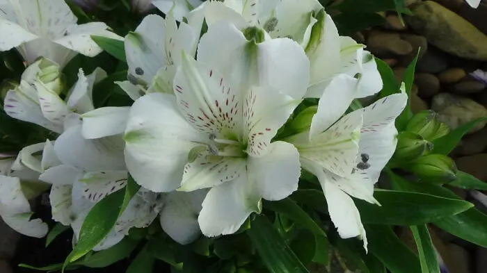 Alstroemeria 'Mazé' bloeit met lelieachtige witte bloemen met fijne kastanjebruine streepjes in de keel.