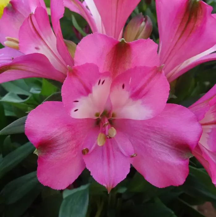 Alstroemeria Inticancha 'Romance' is een bossige incalelie met trossen van helderroze bloemen met wit in de keel.