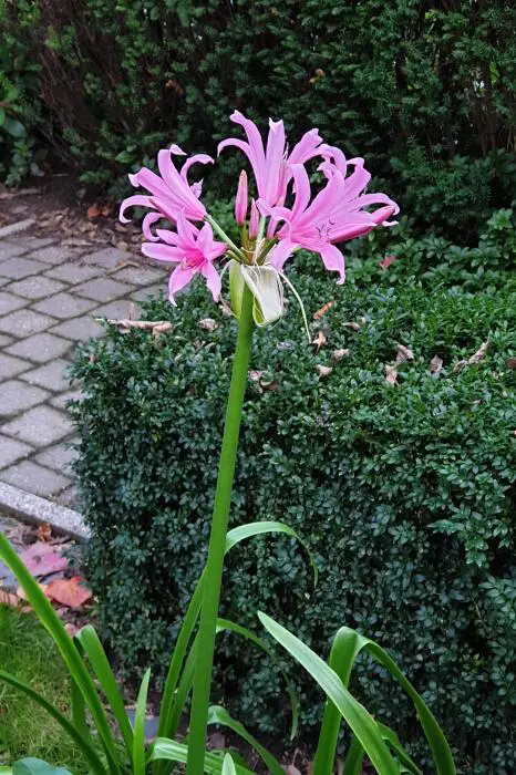 x Amarine tubergenii 'Belladiva Aphrodite'is een kruising tussen Nerine en Amaryllis. Bloeit rijkelijk met grote zachtroze bloemen met donkerroze strepen.