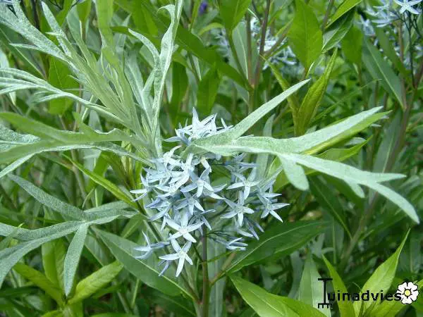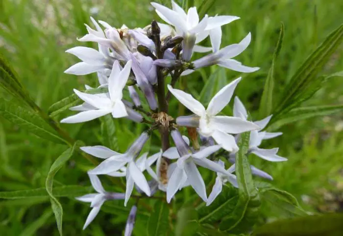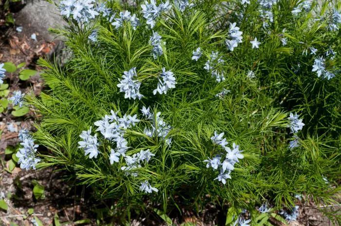 Amsonia ciliata bloeit in de zomer met pluimen van lichtblauwe sterachtige bloemen.