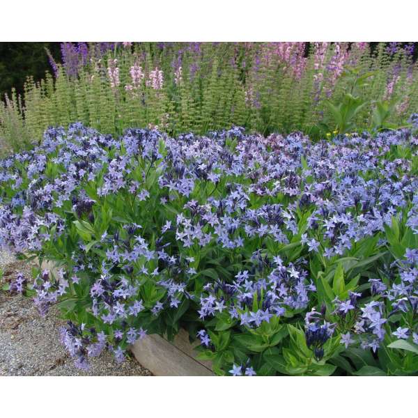 Amsonia 'Blue Ice' een hybride en onderscheidt zich door een langere bloeiperiode met pluimen van kleine sterachtige bloemen met een heel donkere bloembuis en waarvan het lichtblauw intenser en dieper is dan bij elke andere Amsonia.