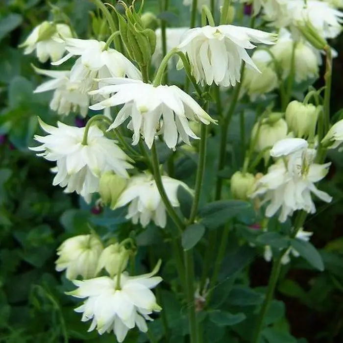 Aquilegia 'Double Rubies' bloeien met dubbele bloemen in een diep robijnrode kleur.