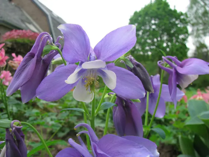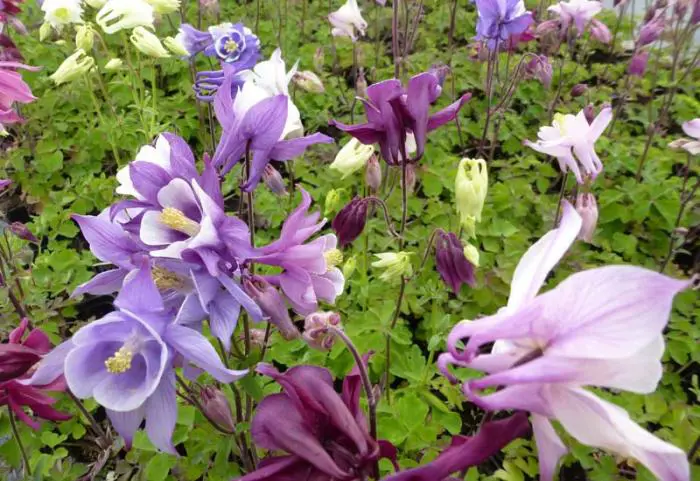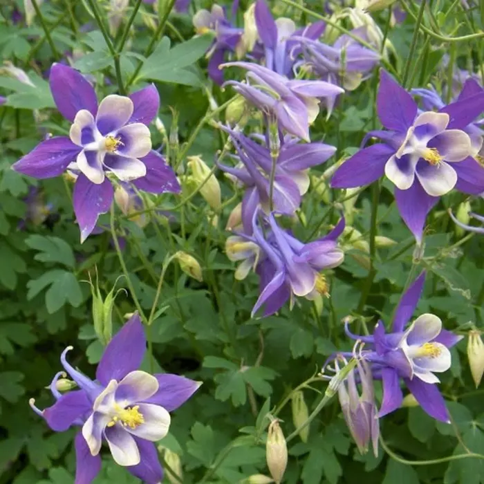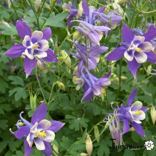 Aquilegia alpina 'Biedermeier' is een zeer sierlijke dwergakelei met naar boven gerichte, enkelvoudige bloemen met gespoorde kroonbladen. De bloemen bloeien wit, roze, paars, rood of blauw op vertakte stijve stengels.
