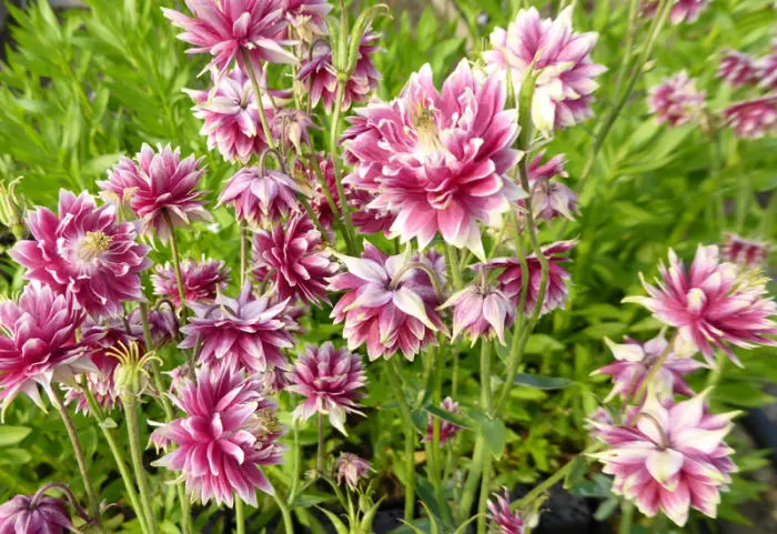 De Aquilegia vulgaris 'Nora Barlow' is een zeer sierlijke vaste plant met naar boven gerichte, roze sporenloze bloemen met witte tippen.