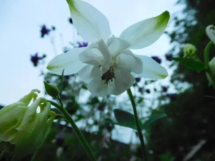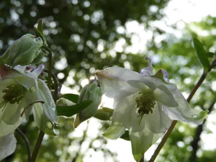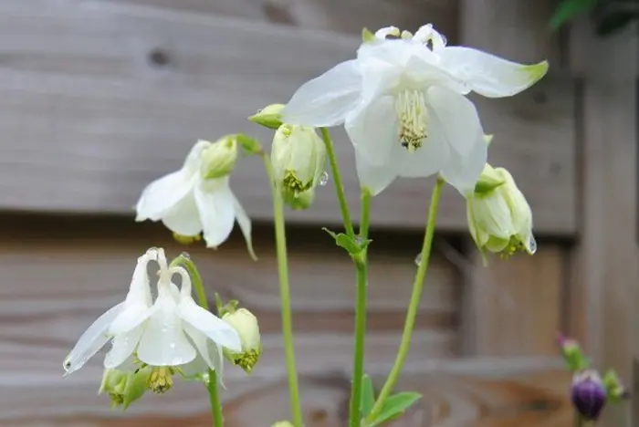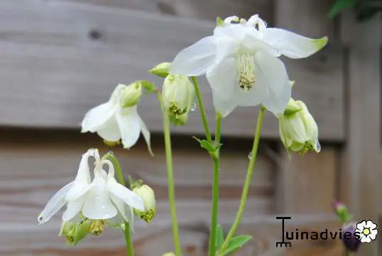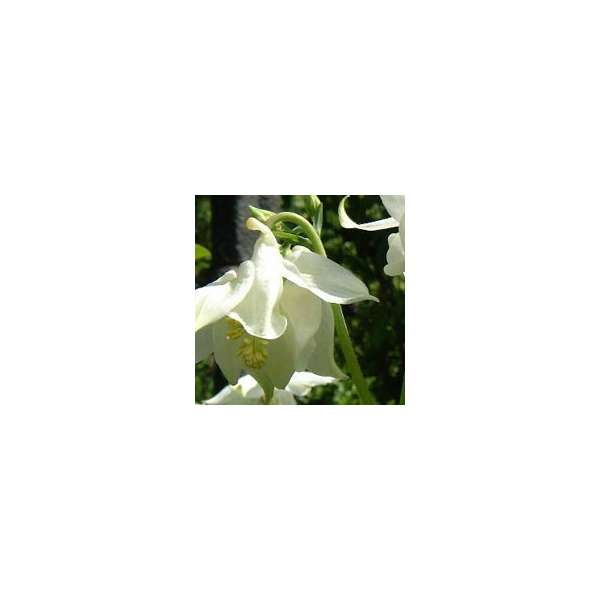 Aquilegia vulgaris 'Nivea' is een zeer sierlijke vaste plant met enkelvoudige witte bloemen met gespoorde kroonbladen.