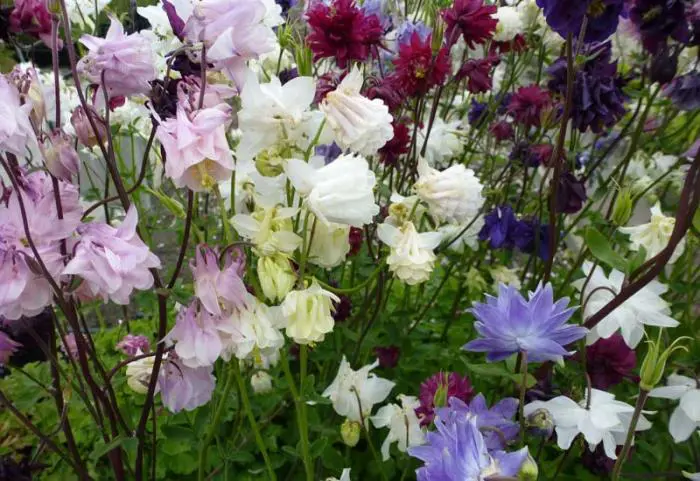 Aquilegia vulgaris 'Plena' zijn zeer sierlijke vaste planten met dubbele bloemen in de kleuren/tinten roze, blauw, purper of gemengd. Bij de dubbele bloemen ontbreken de sporen.