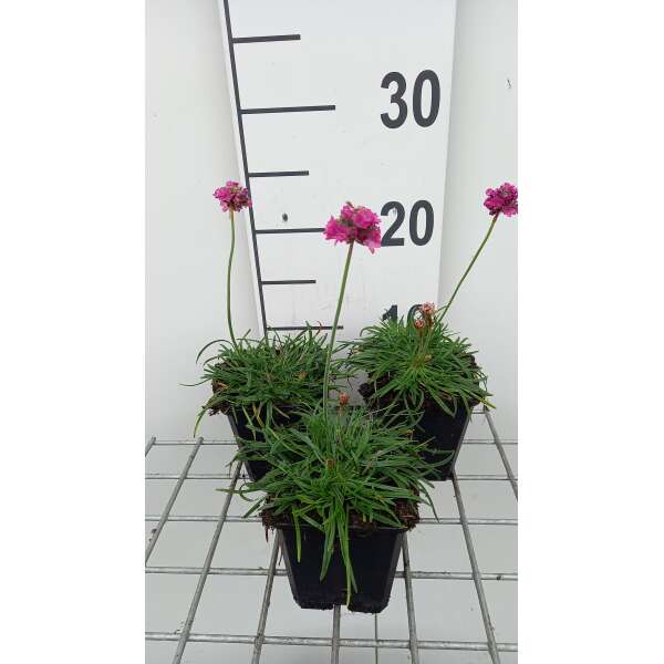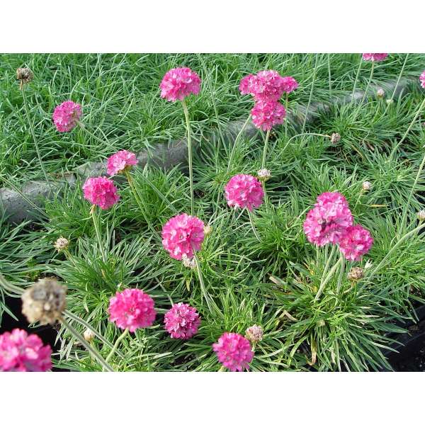 Armeria maritima 'Dusseldorfer Stolz' vormt grasachtige pollen van donkergroene grasachtige bladeren en bloeit rijkelijk met bolvormige rozerode bloemen op stevige stelen.