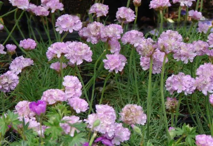 Armeria maritima 'Schöne von Fellbach' vormt grasachtige pollen van donkergroene grasachtige bladeren en bloeit rijkelijk met bolvormige violetroze bloemen op stevige stelen.