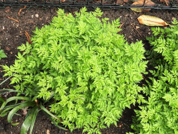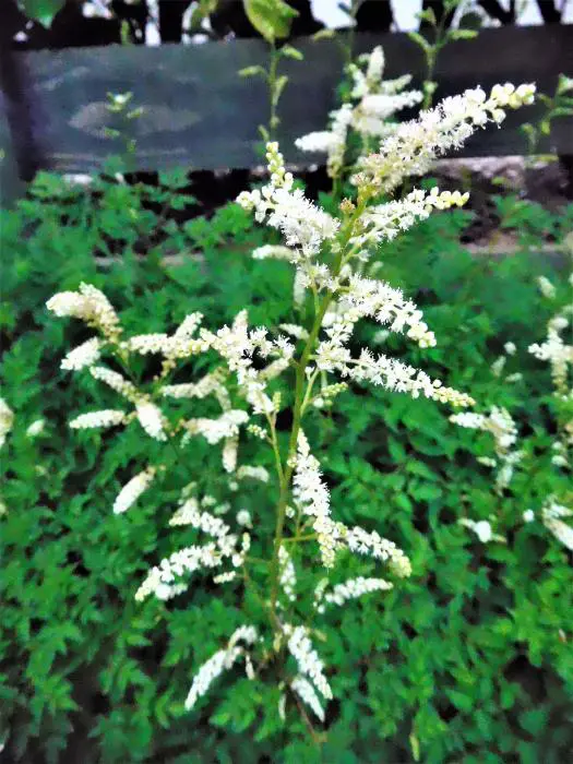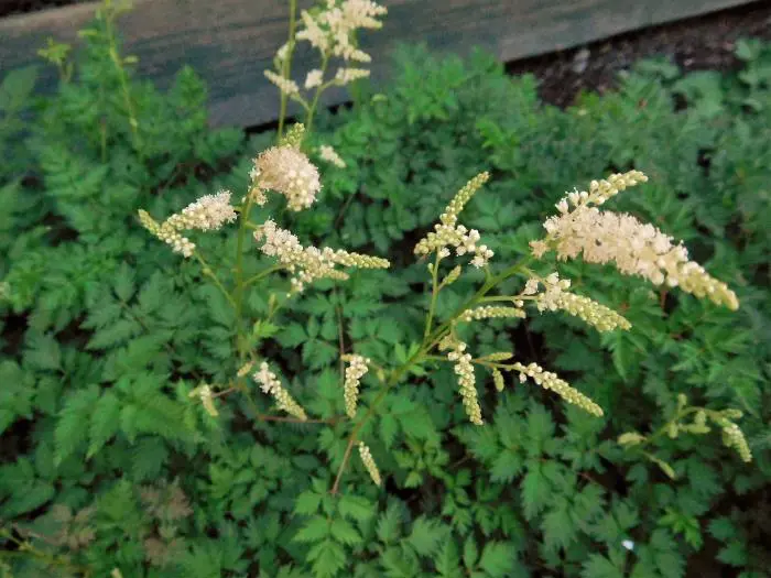 Het varenachtig blad is donkergroen met een bronskleur in het najaar en bloeit aan rode stelen met kleinere roomwitte pluimen.