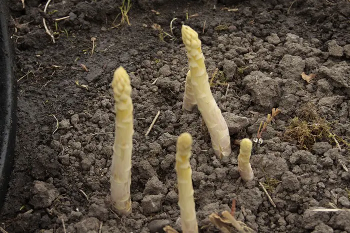 De witte asperges zijn de scheuten die onder de grond gekweekt worden, wilt men groene asperges dan moet men ze meer in de zon kweken.