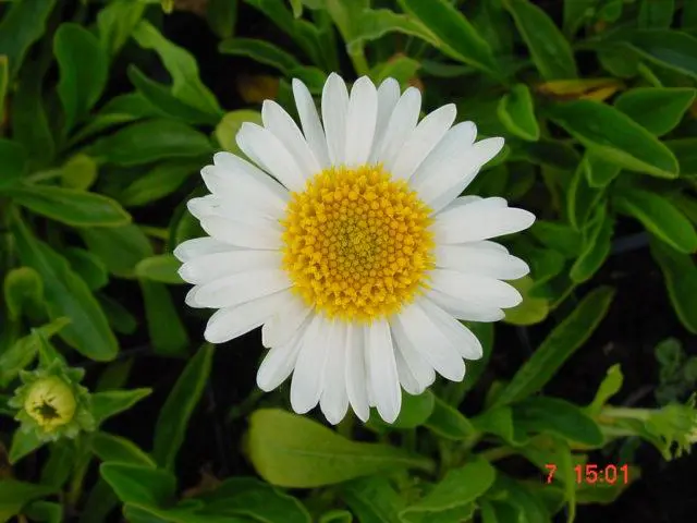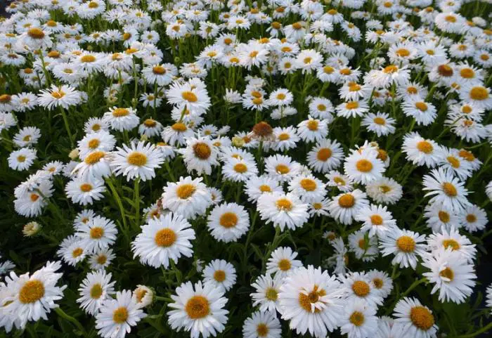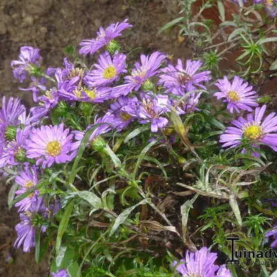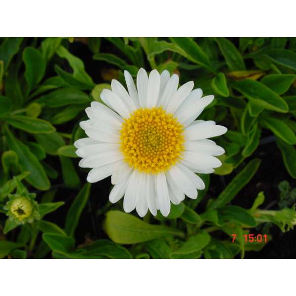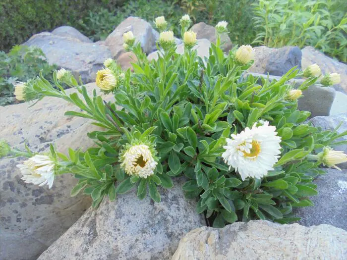 Aster alpinus 'Albus' is een kleine compacte, meerjarige maar kortlevende berg- en bodembedekker met lancetvormige groene bladeren.
