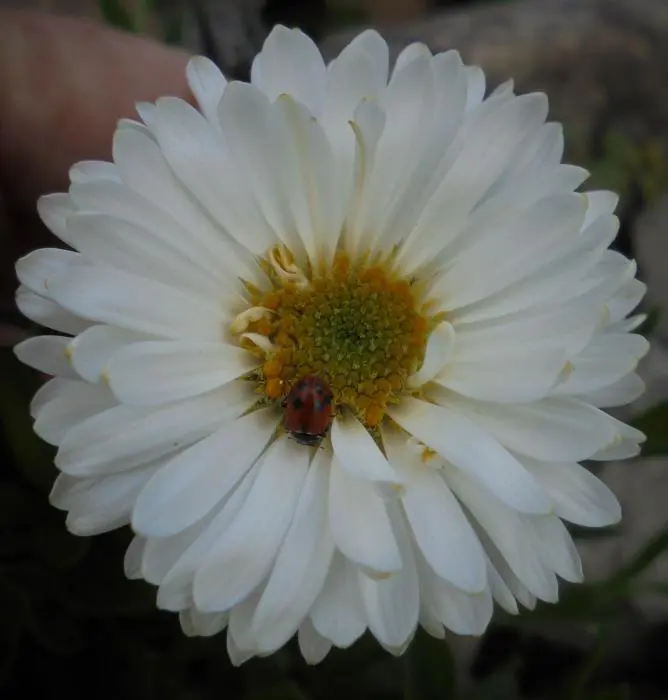 Bloeit met relatief grote witte bloemhoofdjes met een geel hart.