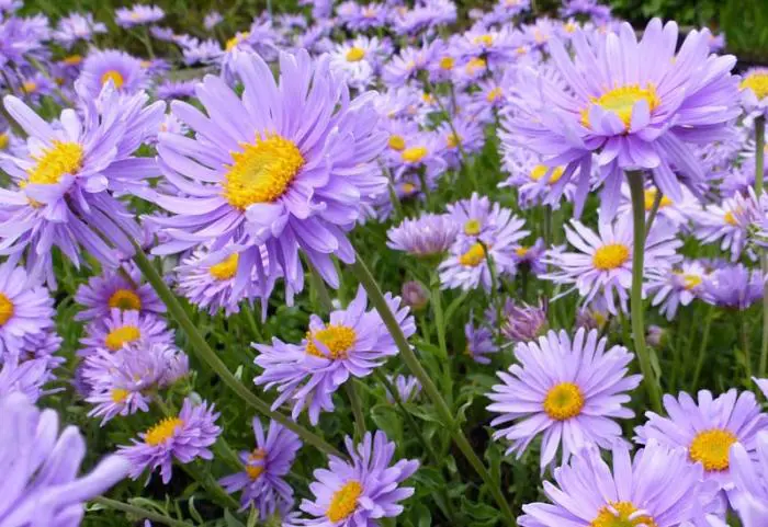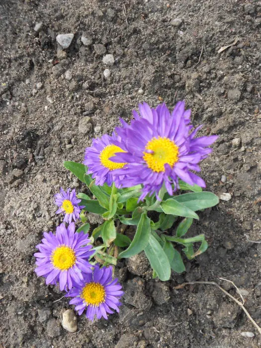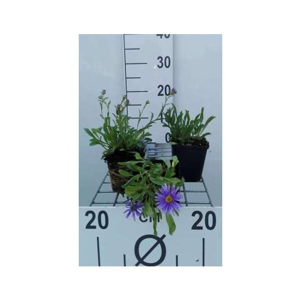 Aster alpinus 'Goliath' is een kleine compacte, meerjarige maar kortlevende berg- en bodembedekker met lancetvormige groene bladeren.