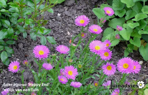 Aster alpinus 'Happy End' is een kleine compacte, meerjarige maar kortlevende berg- en bodembedekker met lancetvormige groene bladeren.