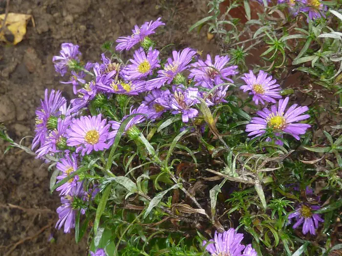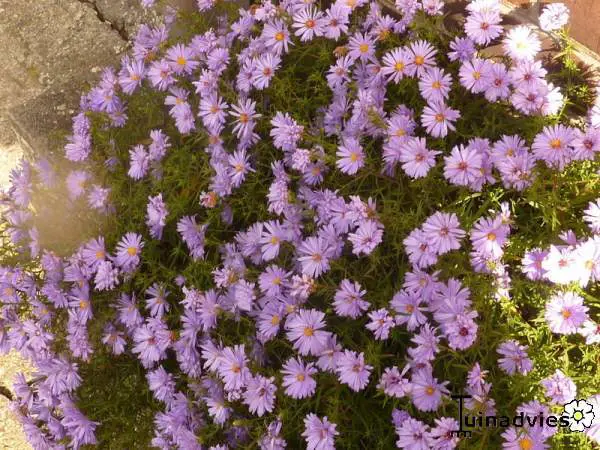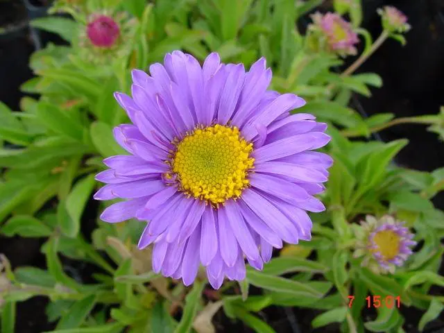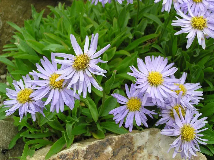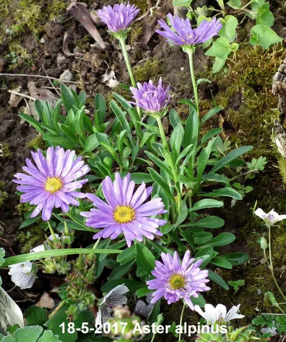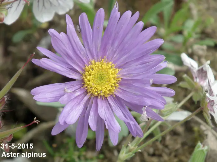 Aster alpinus is een kleine compacte, meerjarige maar kortlevende berg- en bodembedekker met lancetvormige groene bladeren.