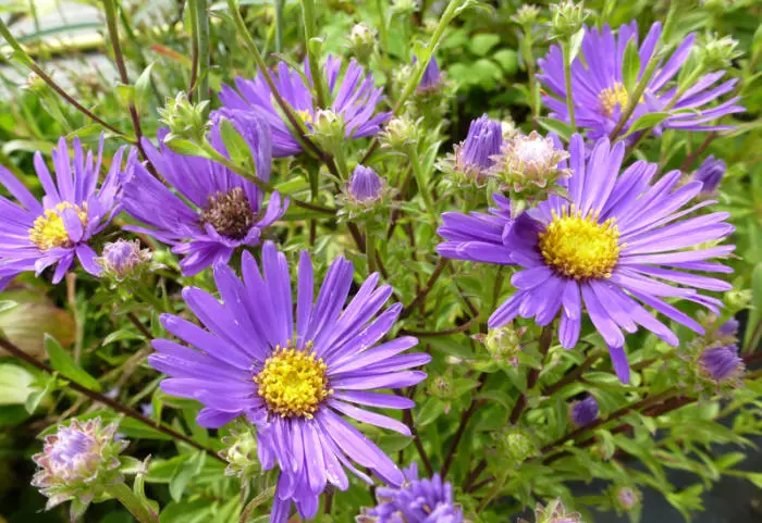 Bloeit aan rechte stengels met iets schermvormige pluimen van stervormige dieppaarse bloemen met in het centrum een geel hartje.