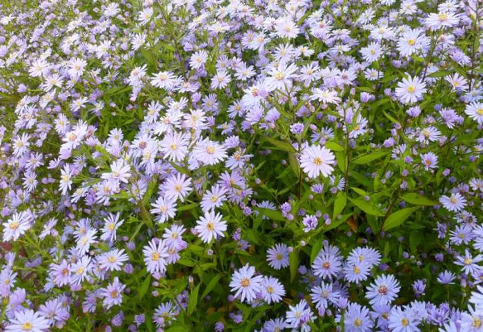 Aster cordifolius 'Blue Heaven' bloeit rijkelijk in het najaar met stralende lilablauwe bloemen met een bruingeel hart.