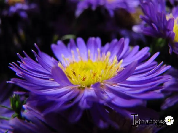 Aster dumosus 'Blue Lapis' is een bossige vaste plant, met een compacte, kussenvormige groeiwijze en blauwe margrietachtige bloemen met een goudgeel hart.