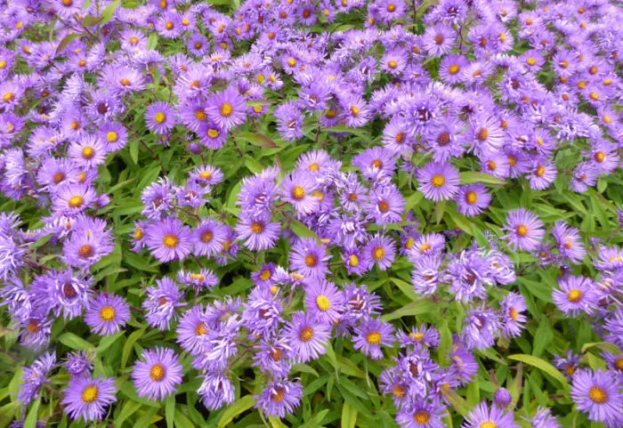Bloeit rijkelijk in het najaar met violetblauwe bloemhoofdjes met fijne bloembladen rond een goudgeel hart.