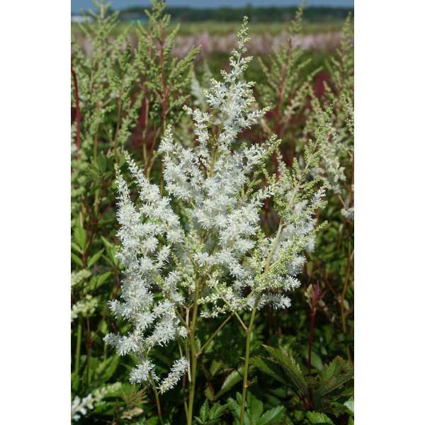 Astilbe arendsii 'Diamant' is een waardevolle plant met mooi gevederd blad en een witte pluimvormige bloeiwijze.