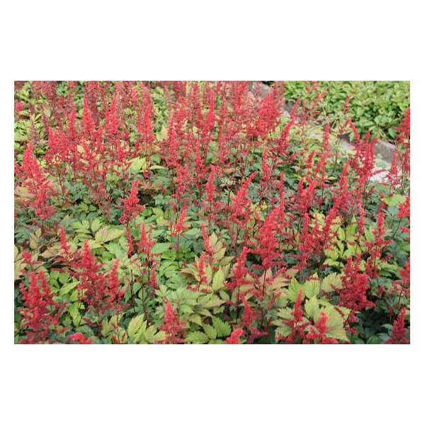 Astilbe x arendsii 'Spinell' is een waardevolle plant met mooi gevederd blad en pluimvormige donkerrode bloeiwijze.