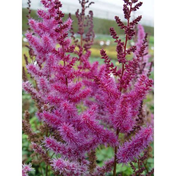 Astilbe chinensis 'Superba' is een waardevolle plant met mooi gevederd blad en helder magentaroze pluimvormige bloeiwijze.