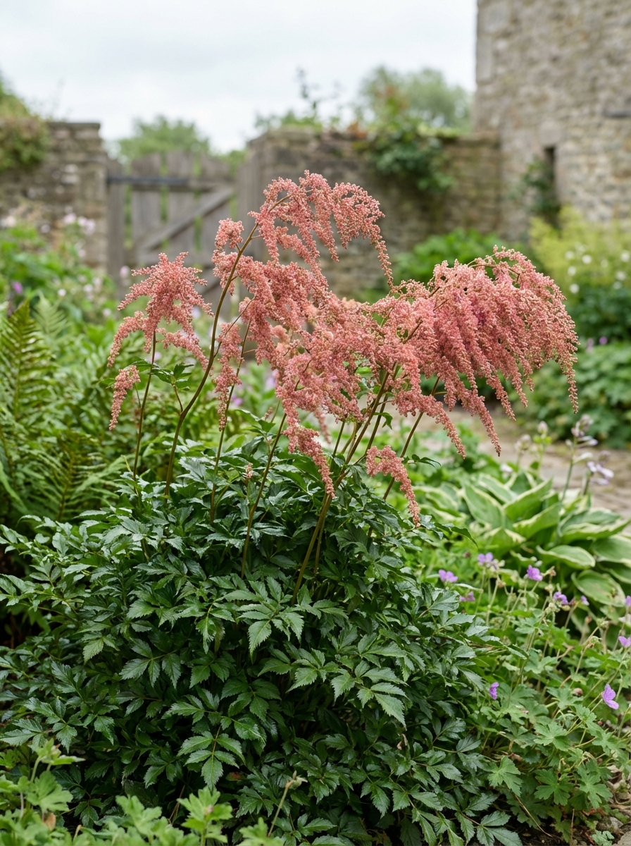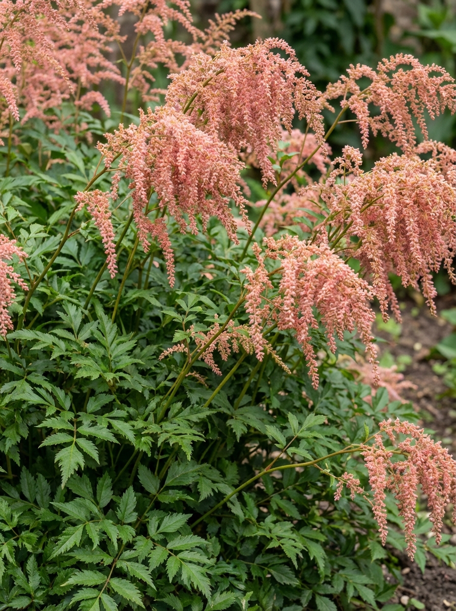 Astilbe thunbergii 'Straussenfeder' bloeiend met zachtroze pluimachtige bloemen.