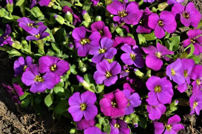 Aubrieta 'Blaumeise' is een zodevormende alpiene plant, vormt een tapijt van donker violetblauwe bloempjes met een klein geel hartje.