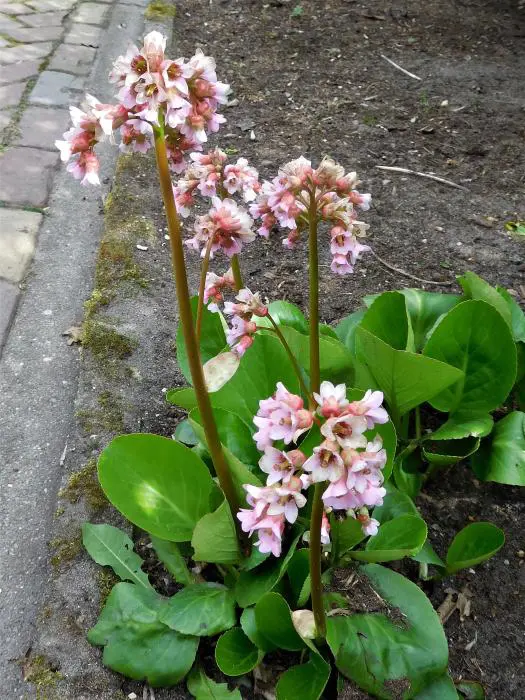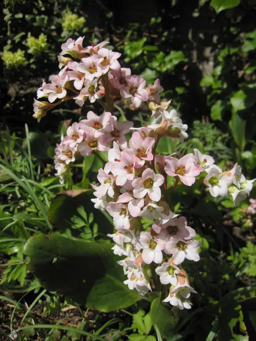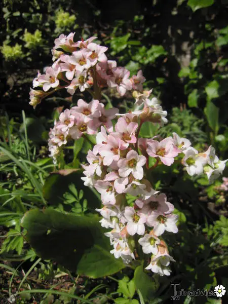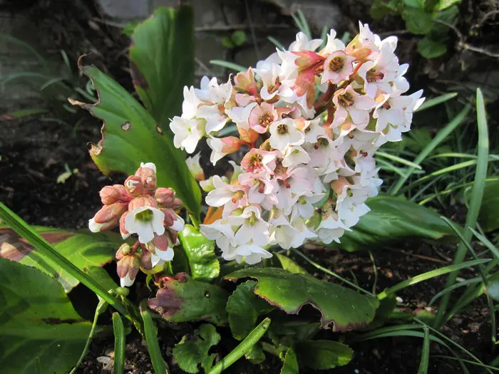 De bloemen van de Bergenia cordifolia 'Schneekönigin' zijn wit met een roze schijn.