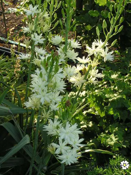 Camassia leichtlinii 'Alba' Camassia leichtlinii 'Caerulea' is een meerjarige bolgewas, groeit vrij snel en bloeit met hoge bloeistengels bezet met roomwitte stervormige bloemen met lange gele meeldraden.