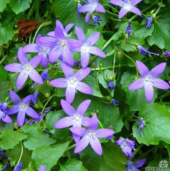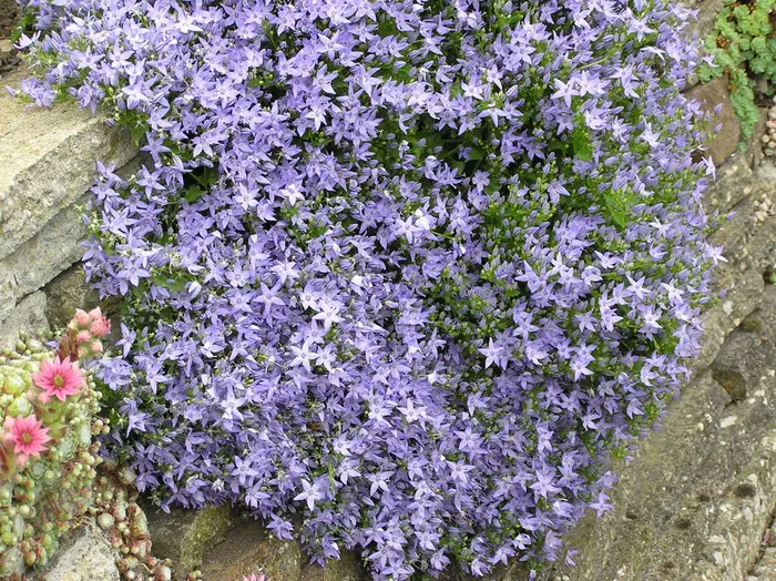 Campanula garganica bloeit met licht lilablauwe stervormige bloempjes aan lange kruipende stengels.
