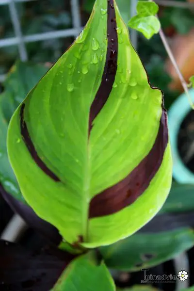 De grote blauwgroene bladeren met rood/bronsgroen zijn erg opvallend, lijken op grote bananenbladeren.