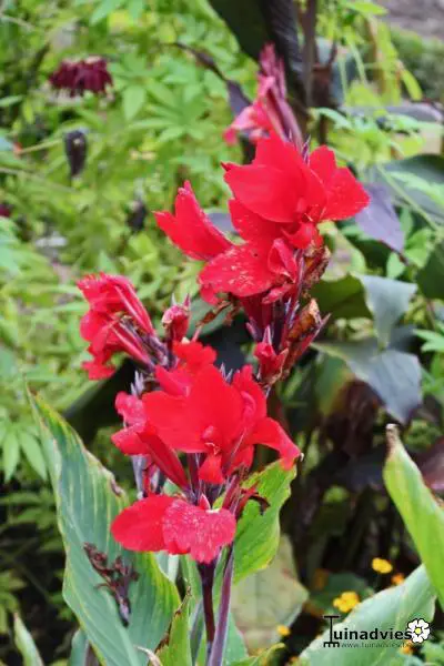Canna 'H.A. Hesse' is een hybride met gladioolachtige scharlakenrode bloemen.