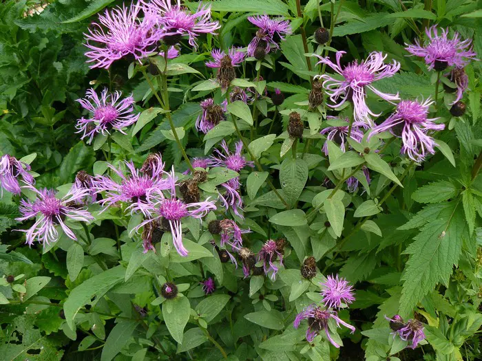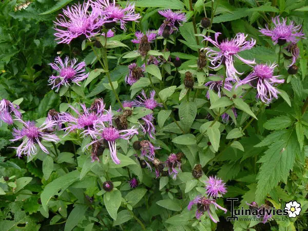 Centaurea 'Caramia' bloeit met paarsroze, losse bloemhoofdjes op rechte stelen.