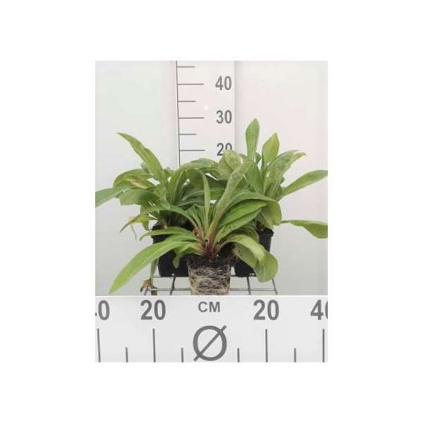 Het blad is grijsgroen, breed lancetvormig en behaard.