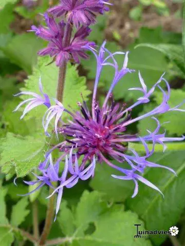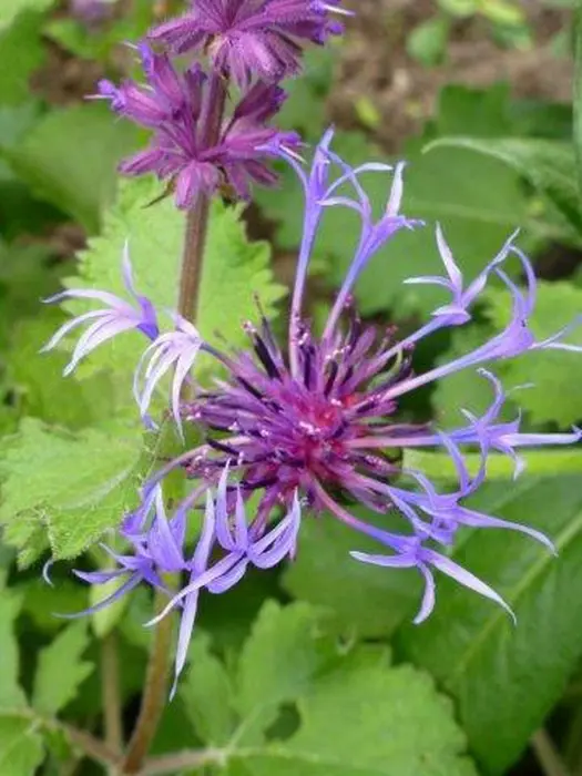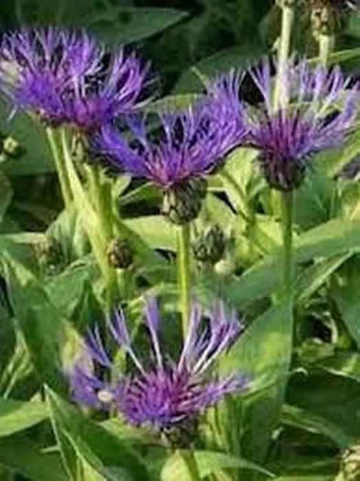 Centaurea montana 'Grandiflora' heeft grotere bloemen dan de soort. Bloeit met losse bloemhoofdjes op rechte stelen. De bloemblaadjes zijn paarsblauw met een rood hart.