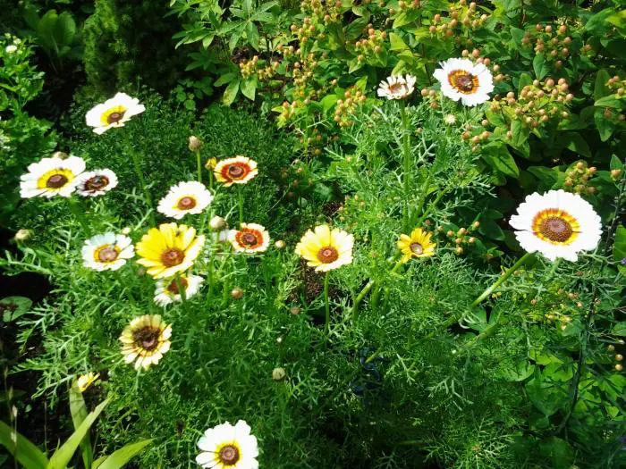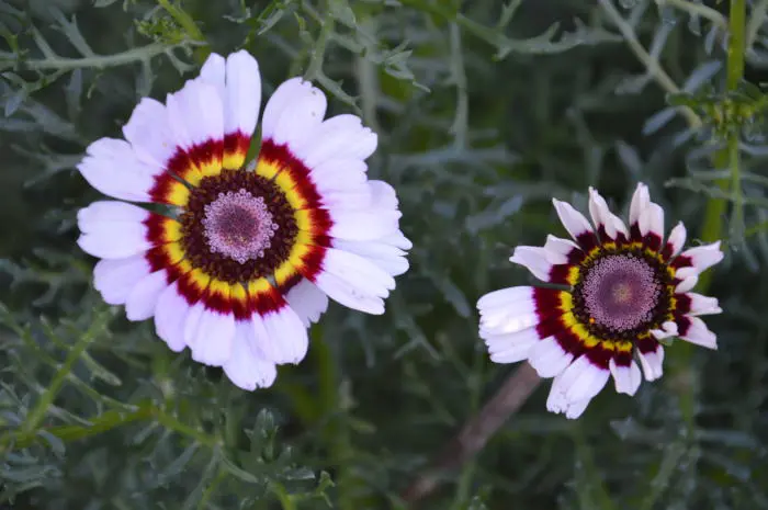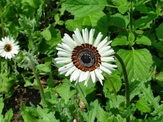 De bloemen lijken op margrieten, zijn wit met een felgele en rode rand rond een paars hart.