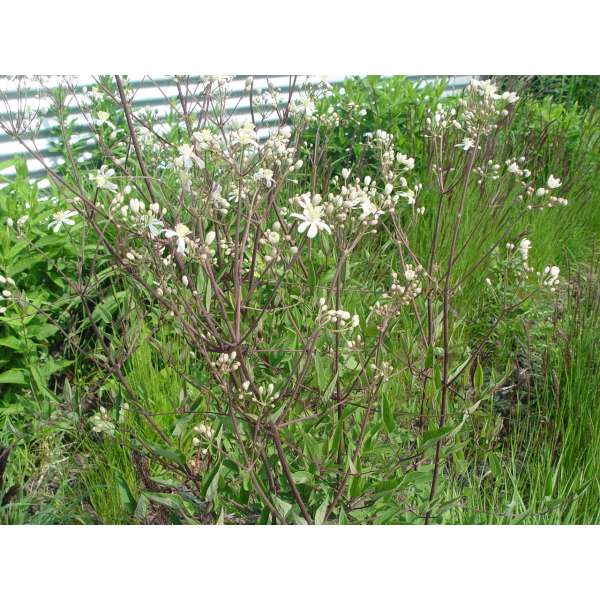 Clematis recta wordt 100cm hoog maar gaat vaak hangen met een massa witte bloemen en kan goed gebruikt worden in kleine heesters die als steun kunnen dienen.