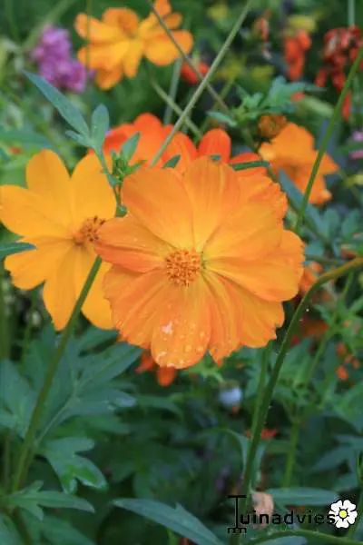 Cosmos sulphureus is inheems in Zuid-Amerika en bloeit met halfgevulde bloemen in een levendige kleur variërend van citroengeel tot oranje en rood.