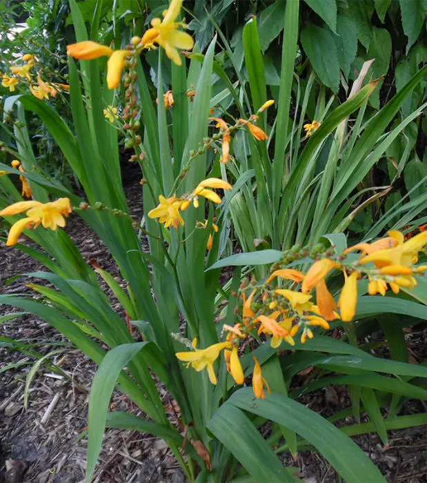 Crocosmia x crocosmiiflora 'George Davidson' is een grootbloemige cultivar met gebogen stengels bezet met oranjegele trechtervormige bloemen.