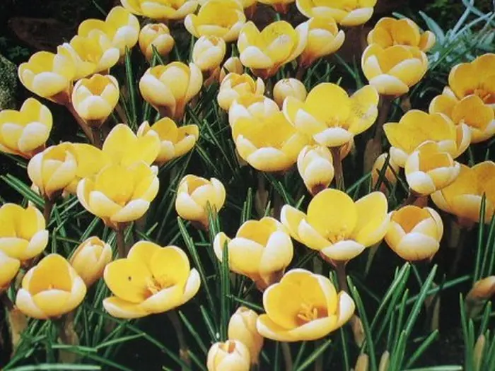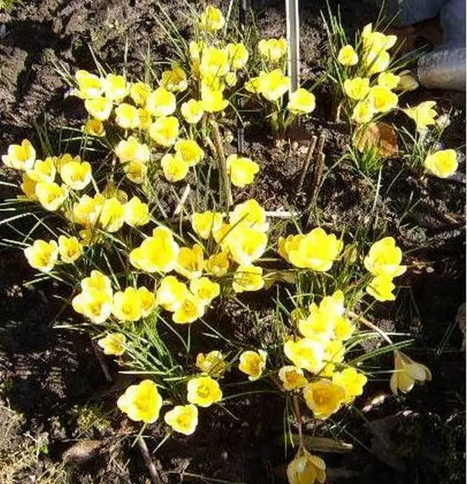 De bloemen van de Crocus chrysanthus 'Romance' zijn citroengeel/roomgeel gestreept met diepgeel in de keel.