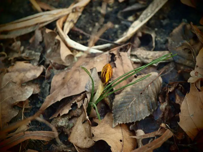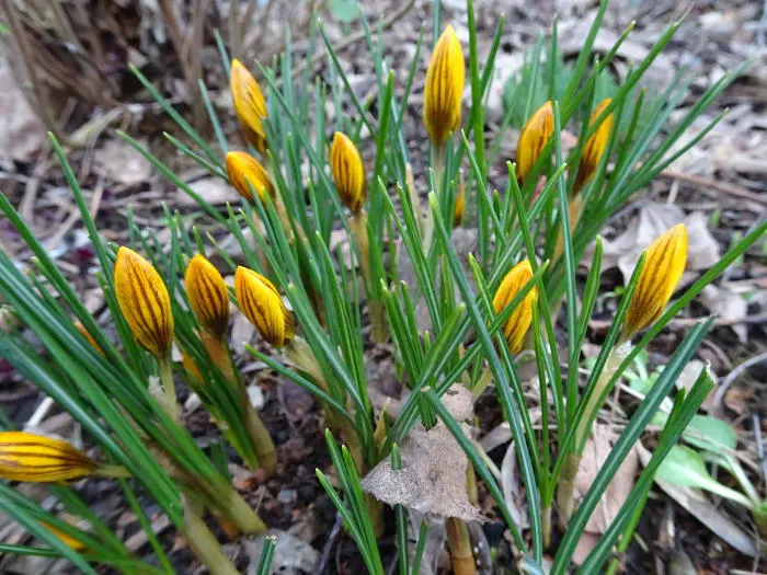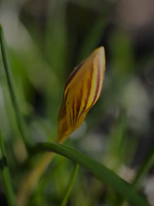 Gele krokus met bronskleurige markeringen op de buitenkant, nà de bloei het blad laten afsterven.