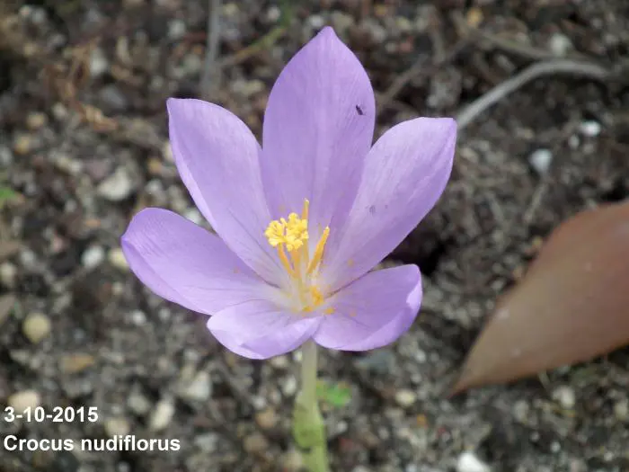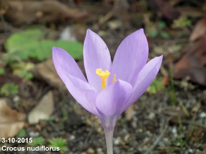 Crocus nudiflorus komt massaal voor in de Pyreneeën. Bloeit met grote paarse bloemen met opvallende oranjegele soms witte stijlen. Het grasachtig blad verschijnt pas op het einde van de bloei.