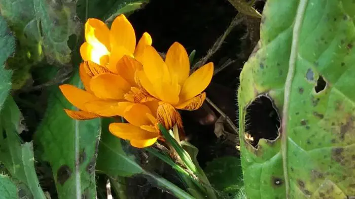 Een kleinbloemige botanische krokus uit de olivieri groep. Bloeit met okergele tot oranje bloemen met koperachtig, bruine accenten op de buitenste bloemblaadjes.