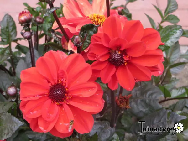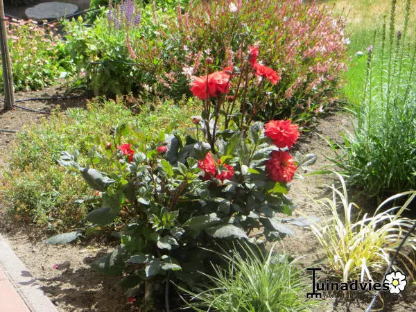 De dieprode bloemen combineren mooi met de donkere roodpaarse bladeren.