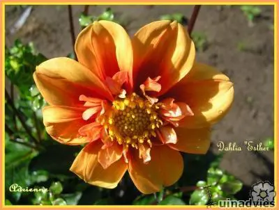 Dahlia 'Esther' is een halskraagdahlia (collerette). De bloemen hebben één rij brede, platte lintbloemen en rond het hart een rij van kortere straalbloemen. De bloemen zijn oranje met donkeroranje rond het hart.